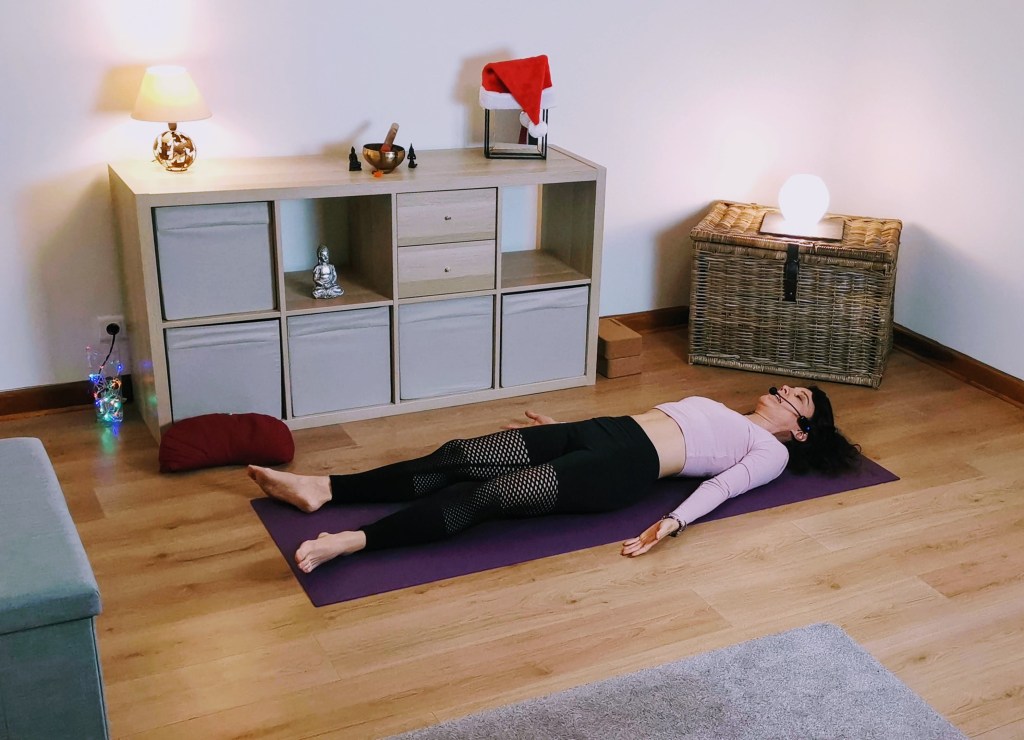 Shavasana, la position couchée au yoga signifie littéralement posture du cadavre en sanskrit. A la fin de chaque cours nous terminons par une relaxation en position allongée sur le tapis. Accompagnée parfois de bol tibétain ou de petits instruments, je vous guide à travers une expérience de relaxation profonde. Cela permet d’intégrer ce que nous avons fait ensemble pendant le cours. Et cela permet surtout de vivre un instant agréable de relâchement du corps.