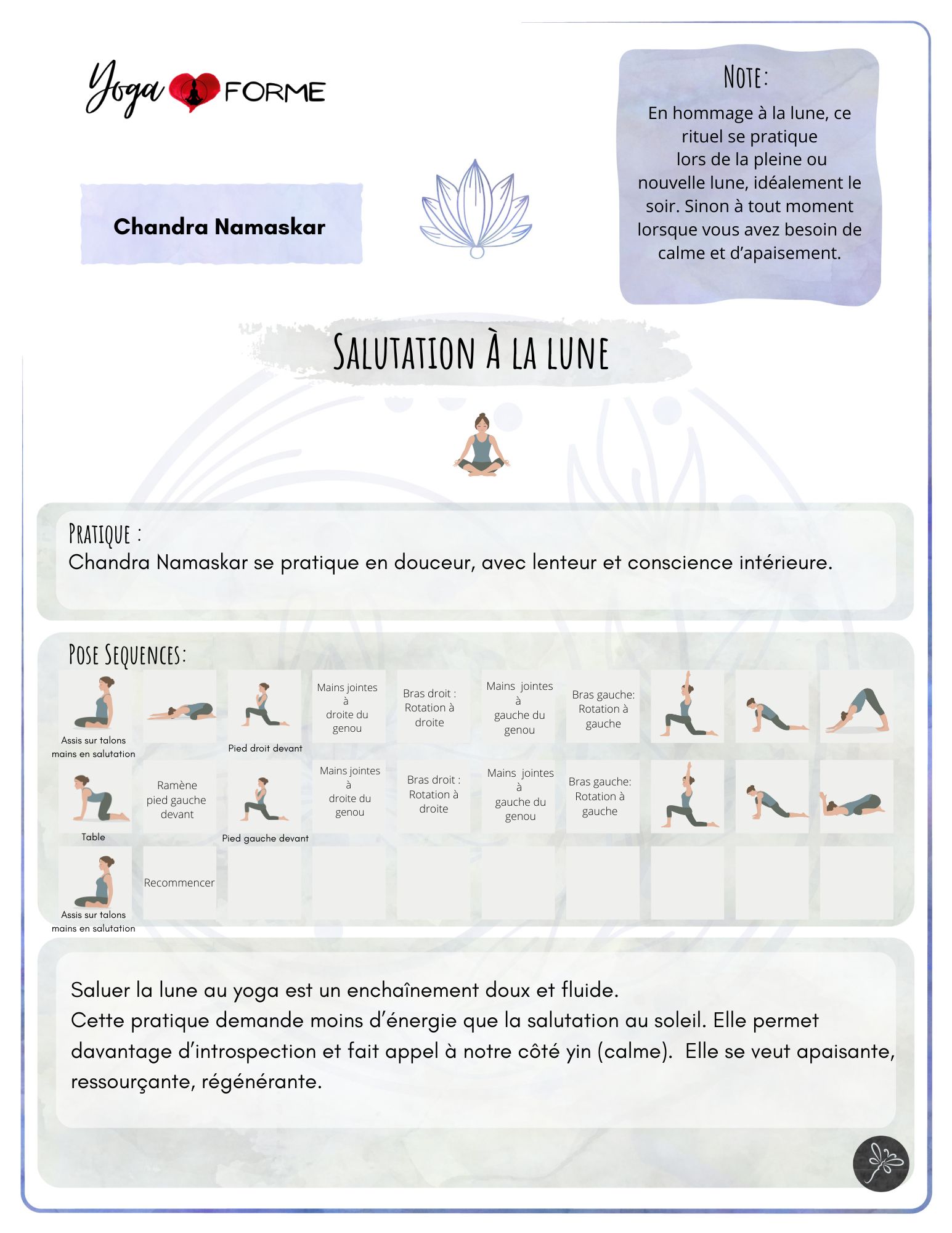 Voici donc un document que vous pouvez imprimer avec l’enchaînement des postures de la salutation à la lune.