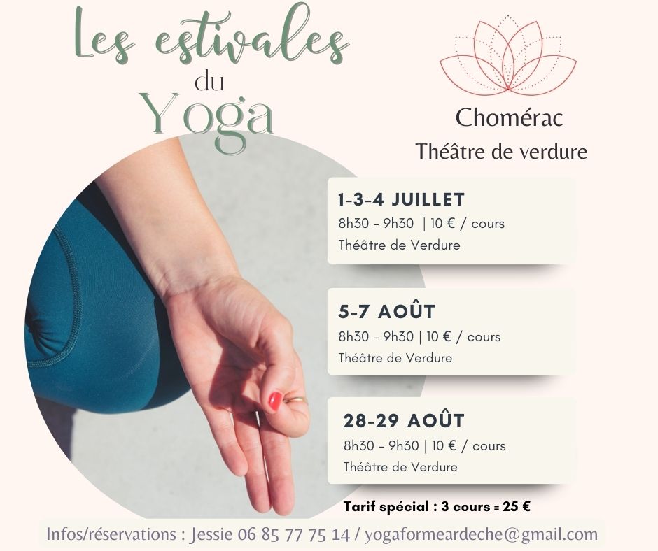 - Tarif spécial « yogi motivé » : 3 cours pour 25 €. Choisissez vos dates pendant l’été. Attention, non remboursable. Vous hésitez ? Essayez un cours (10 €) et ensuite si vous aimez, payez 15 € pour les deux prochains cours.